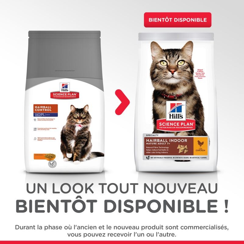 Hill's Science Plan Feline Mature Adult 7+ Hairball Control chicken (Boules de poils au poulet) aide à éviter la formation de boules de poils chez le chat de plus de 7 ans. Une formule qui convient à une alimentation quotidienne et qui contient des antioxydants à l'efficacité cliniquement prouvée et une teneur en phosphore adaptée.