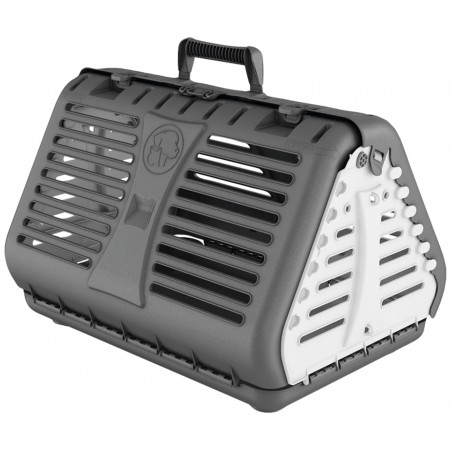 La cage de transport s'ouvre sur le dessus, devant ou derrière. Celle-ci est pliable pour prendre moins de place lorsque que vous ne vous en servez pas.