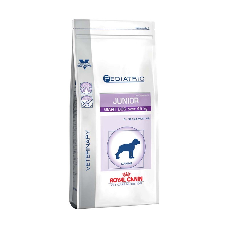 Royal Canin Vet Care Nutrition Dog Junior Giant est un aliment complet destiné aux chiots de 8 à 18/24 mois de races géantes (poids adulte > 45kg) ou ayant une sensibilité digestive et/ou articulaire. Son niveau élevé de protéines aide à favoriser le développement musculaire optimal pendant la croissance et contribue aussi au bon développement de la masse maigre par rapport à la masse grasse.