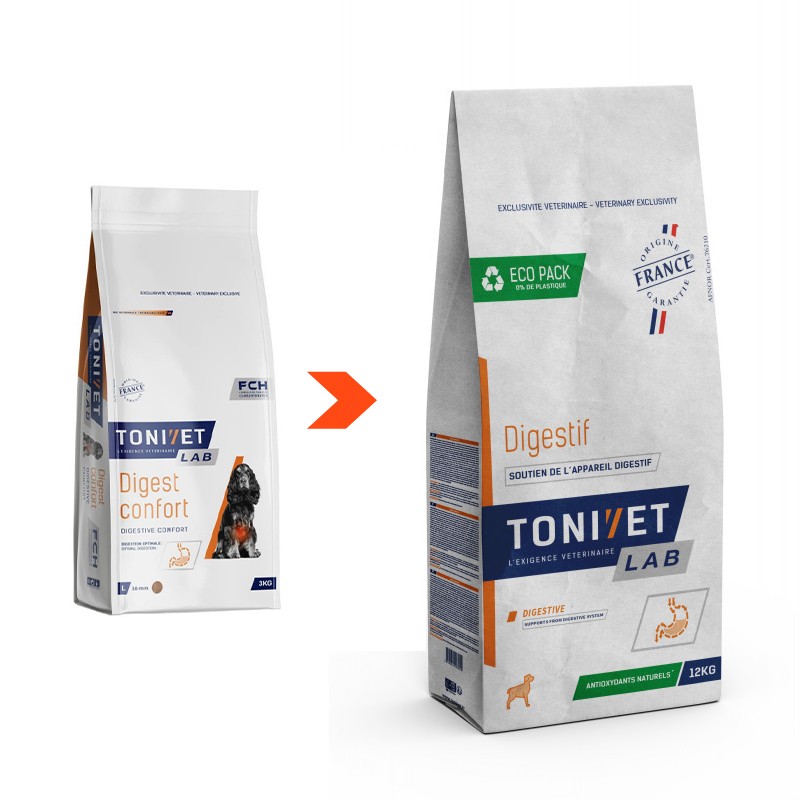 La gamme Tonivet se réinvente avec une composition plus riche en protéines et des sacs en papier recyclable. À épuisement des stocks, les croquette Tonivet Chien Digest Confort seront supprimées et remplacées par les Tonivet Chien Digestif.