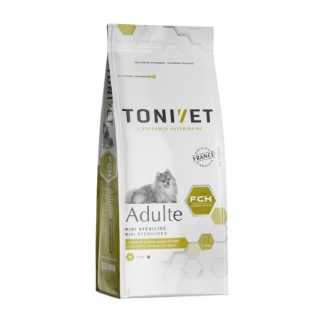 Croquettes Tonivet Chien Adulte Mini Stérilisé, formulées pour aider à maintenir un poids de forme optimal chez les chiens stérilisés de petite taille.