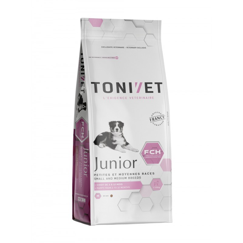 Tonivet Chien junior race petite et moyenne est une alimentation spécialement formulée pour les chiots de 2 à 12 mois et pesant moins de 25 kg à l'âge adulte.