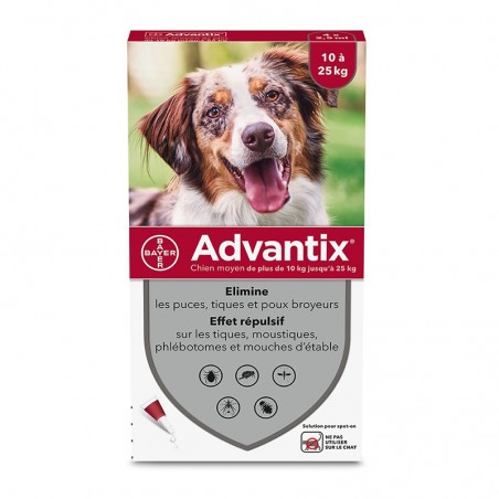 Advantix contient deux substances actives, l’imidaclopride et la perméthrine, qui agissent en association pour tuer et/ou repousser les puces, tiques, moustiques, phlébotomes, poux et mouches d'étable.