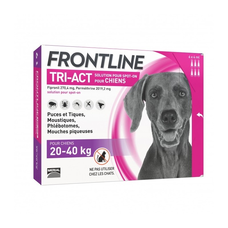 Frontline Tri-Act chiens est un traitement antiparasitaire pour chiens à l'effet radical contre 5 parasites (puces, tiques, moustiques, phlébotomes et mouches piqueuses).