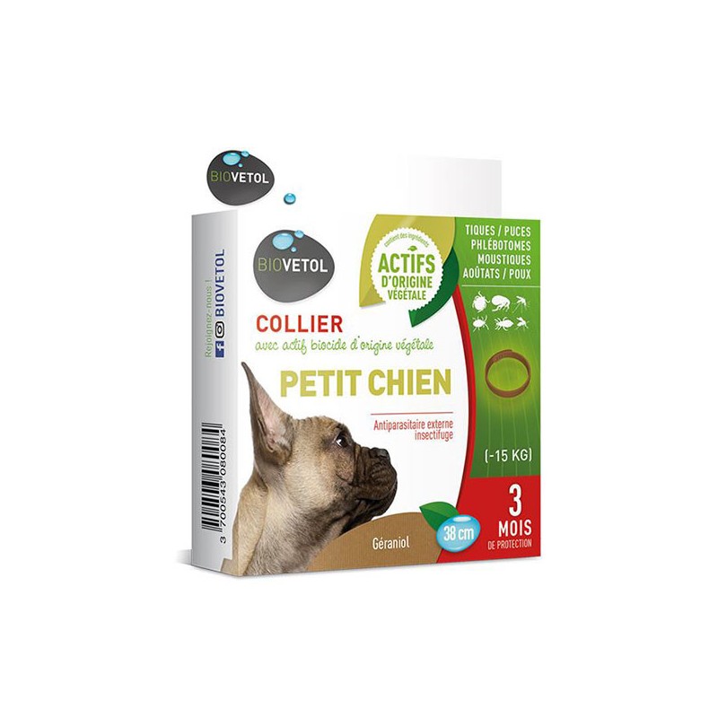 Collier Biovetol, un antiparasitaires pour chien au principe actif 100% végétal. Lutte efficacement durant 3 mois contre les puces, tiques, moustiques, aoûtats, phlébotomes et les poux. Résistant à l'eau.