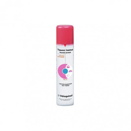 Tiquanis Habitat Spray est un antiparasitaire pour l'habitat et tout spécialement conçu pour traiter les endroits plus localisés comme les dessous des meubles, les couchages,...).