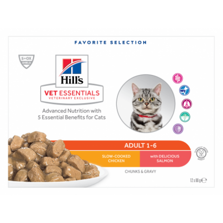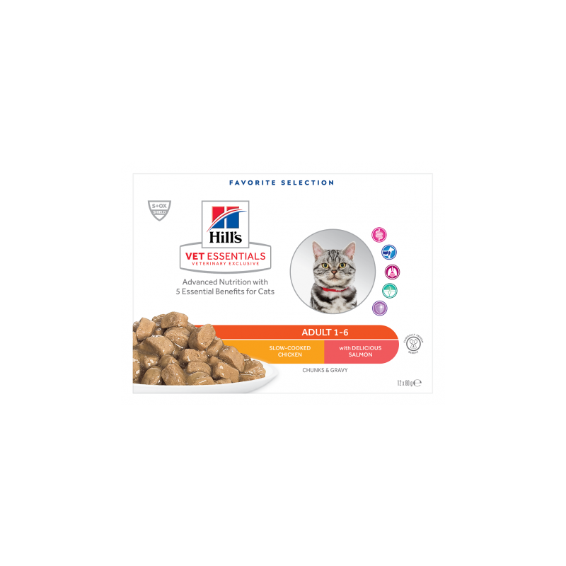 Hill's Vetessentials feline Adult Poulet Saumon est une pâtée en sachet fraicheur formulée pour répondre aux 5 besoins essentiels des chats adultes de 1 à 6 ans.