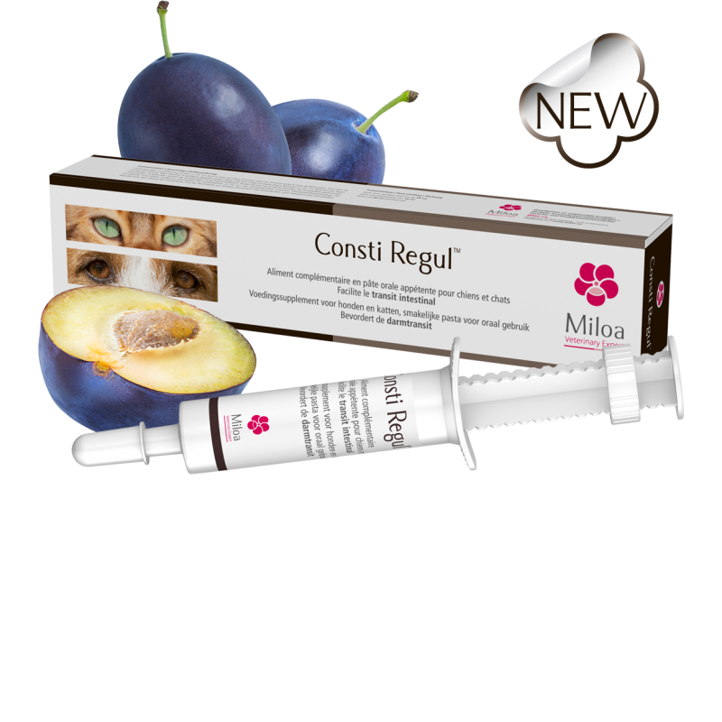 Consti regul Miloa est un complément alimentaire spécialement étudié pour faciliter l’évacuation des selles dures et des boules de poils chez les chiens et les chats.
