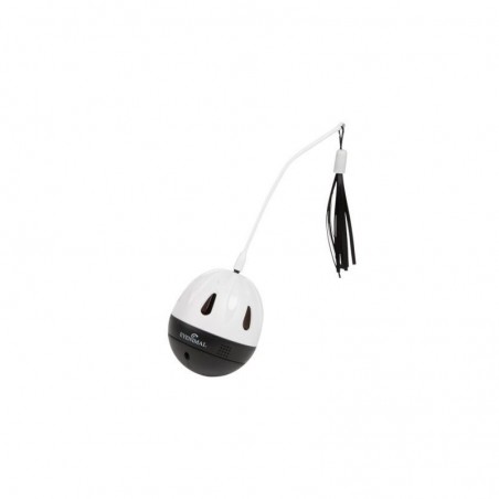 Jouet distributeur de friandises ou de croquettes pour chat. Interactif avec son et rubans pour stimuler son instinct de chasseur. Tourne sur lui-même pendant 1 mn et se met en pause pendant 30 s, puis recommence.