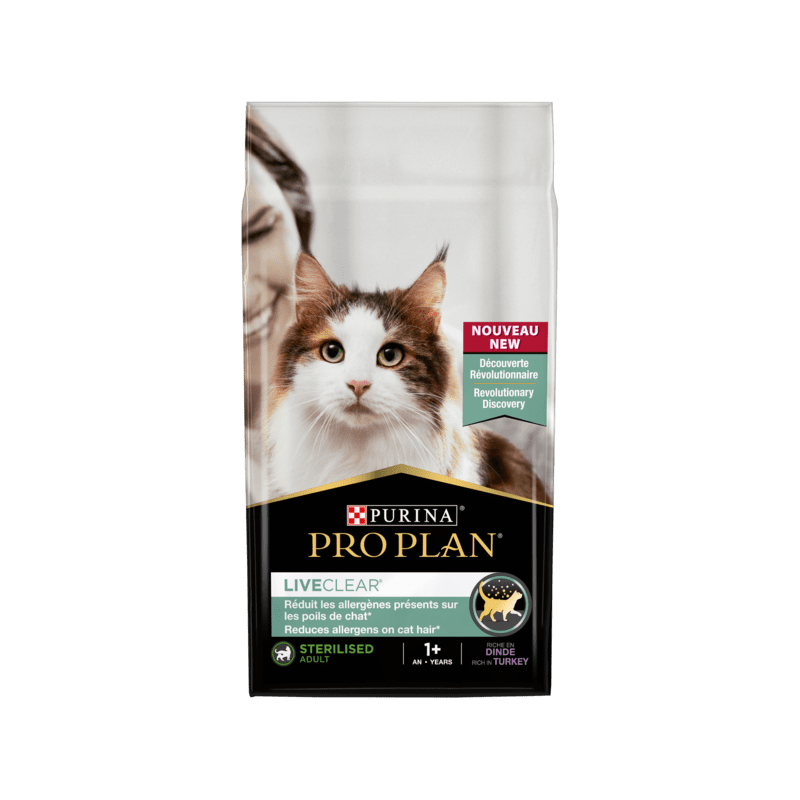 Pro Plan Cat Liveclear Sterilised Adult à la dinde est une alimentation complète et équilibrée destinée aux chats stérilisés à partir de 1 an, qui réduit de manière efficace et sans risque les allergènes sur les poils et les squames de chat, dès trois semaines d'utilisation quotidienne.