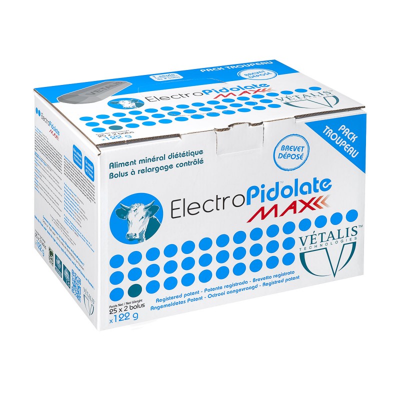 Le bolus Electropidolate Max est un complément alimentaire naturel, riche en calcium et en magnésium, destiné à améliorer le démarrage de la lactation et les performances de la production laitière en réduisant la fièvre de lait chez les vaches laitières.