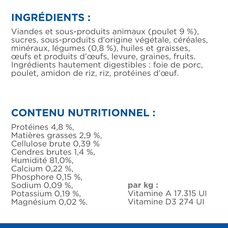 Viandes et sous-produits animaux (poulet 9%), sucre, céréales, huiles et graisses, substances minérales, graines, sous-produits d’origine végétale, légumes (0,8%), oeufs et sous-produits d'oeufs, levure, fruits. Ingrédients hautement digestibles : Foie de porc, poulet, amidon de riz, riz, protéines d'oeufs.