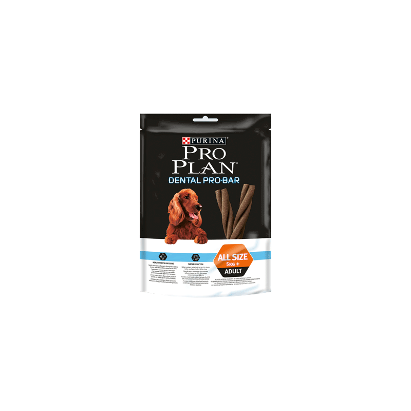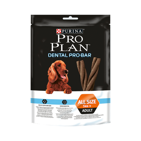 Les sticks Purina Proplan Adult Dental Pro Bar sont des friandises à mâcher pour le soin dentaire des chiens à partir de 5 kg. Elles aident à éliminer la plaque dentaire, massent et apaisent les gencives.
