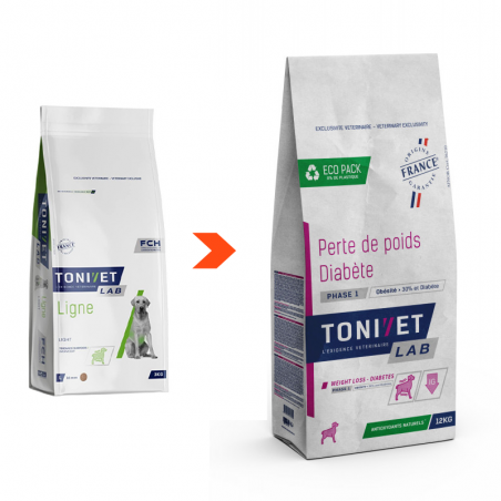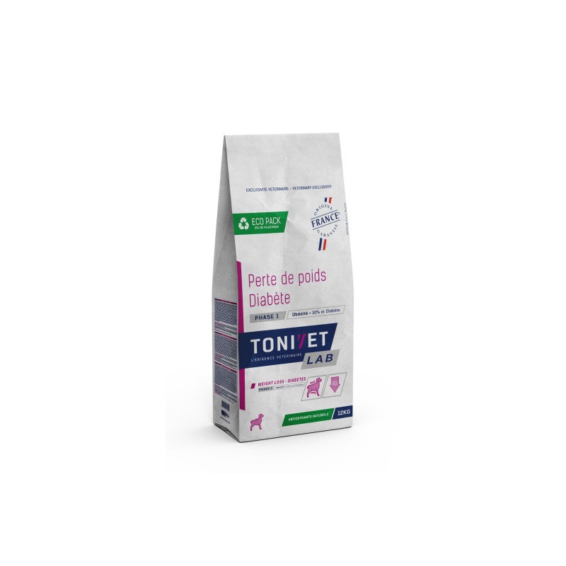 Les croquettes Tonivet Chien Perte de poids Diabète Phase 1, sont formulées pour les chiens ayant une surcharge pondérale de plus de 30% ou les chiens diabétique.